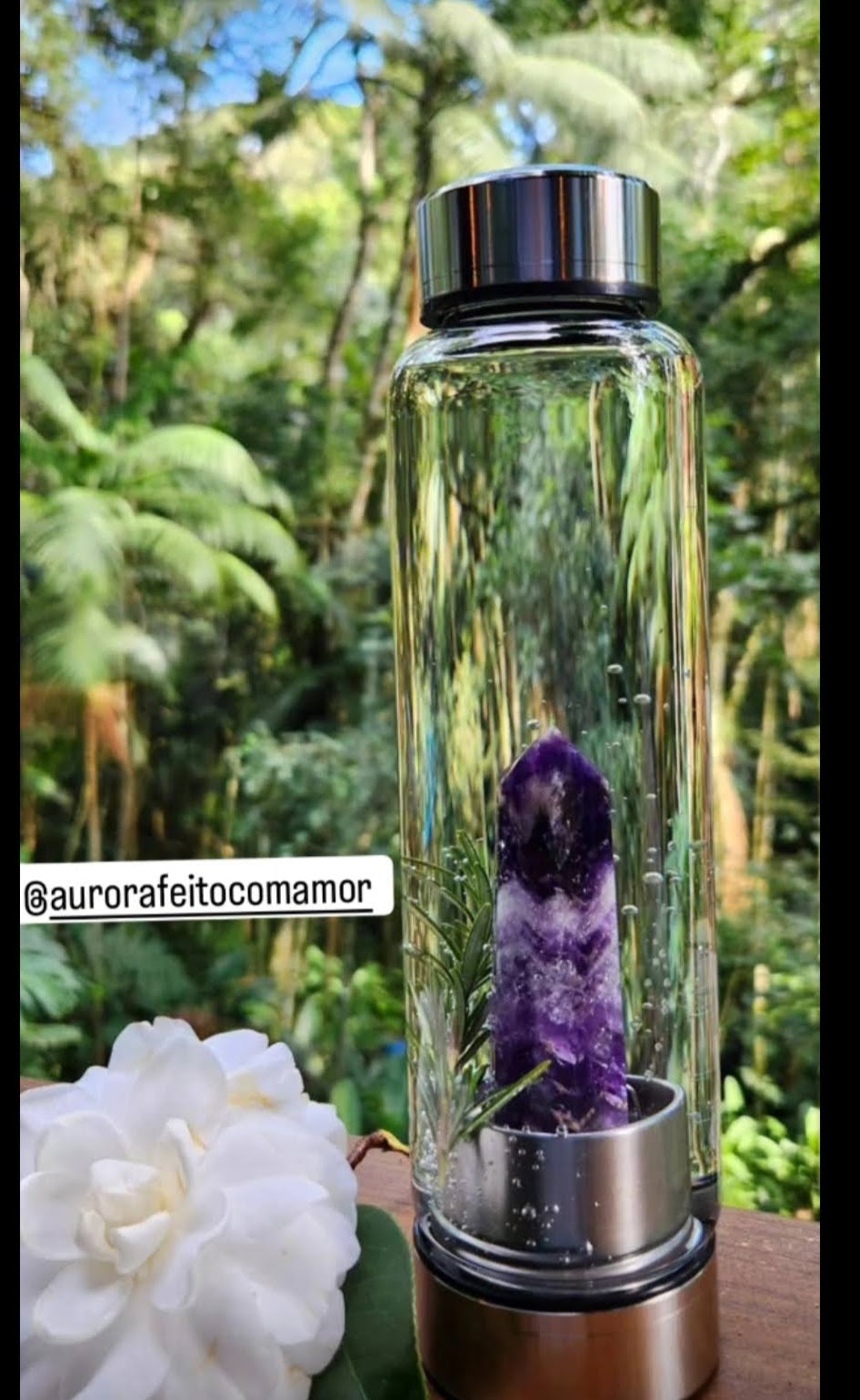 contém 1 garrafa de vidro com pedra de ponta de Ametista.