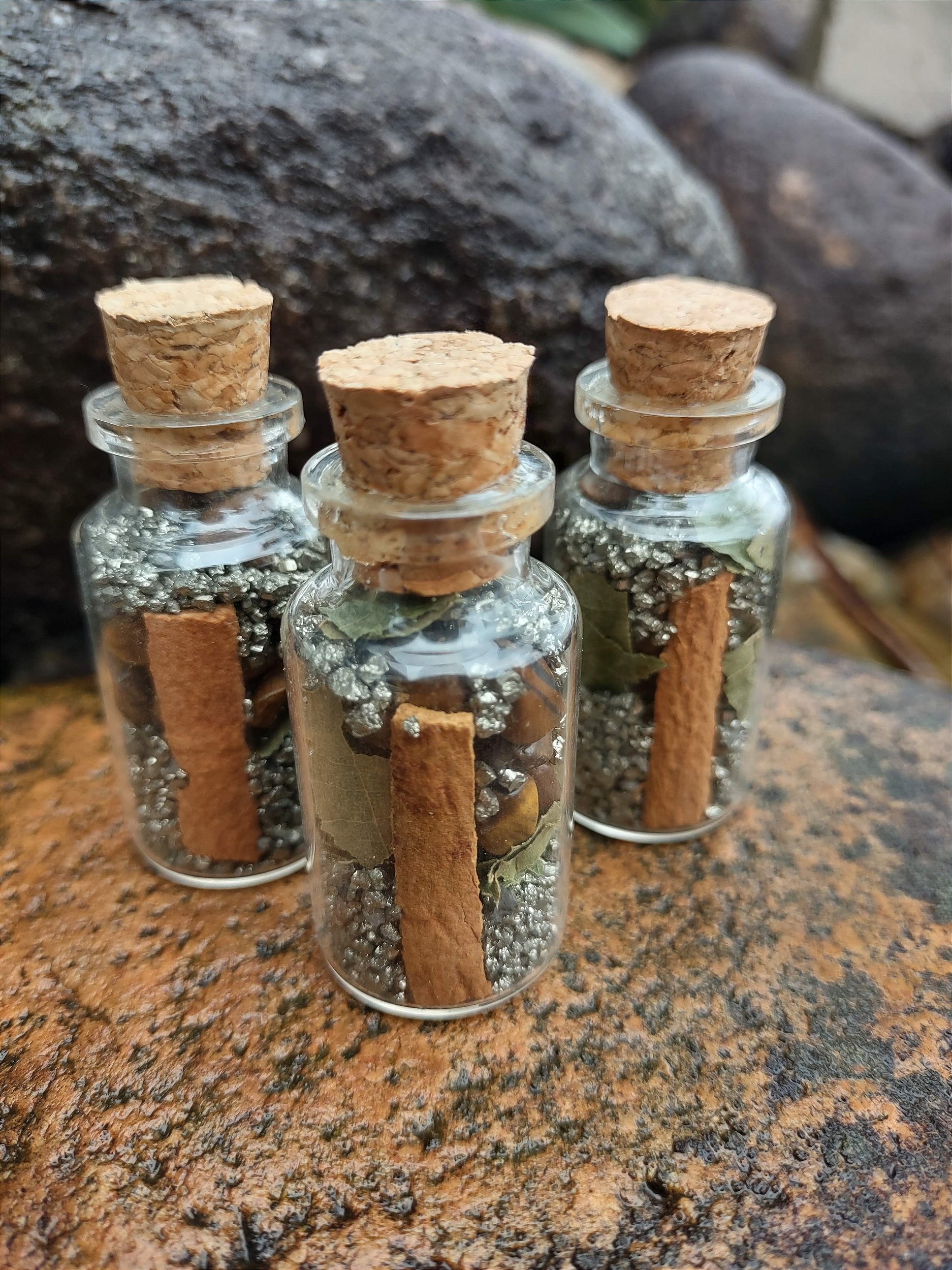 Contém 1 frasco de vidro com Pirita, Louro, Olho de Tigre, Canela e muitas boas energias envolvidas.