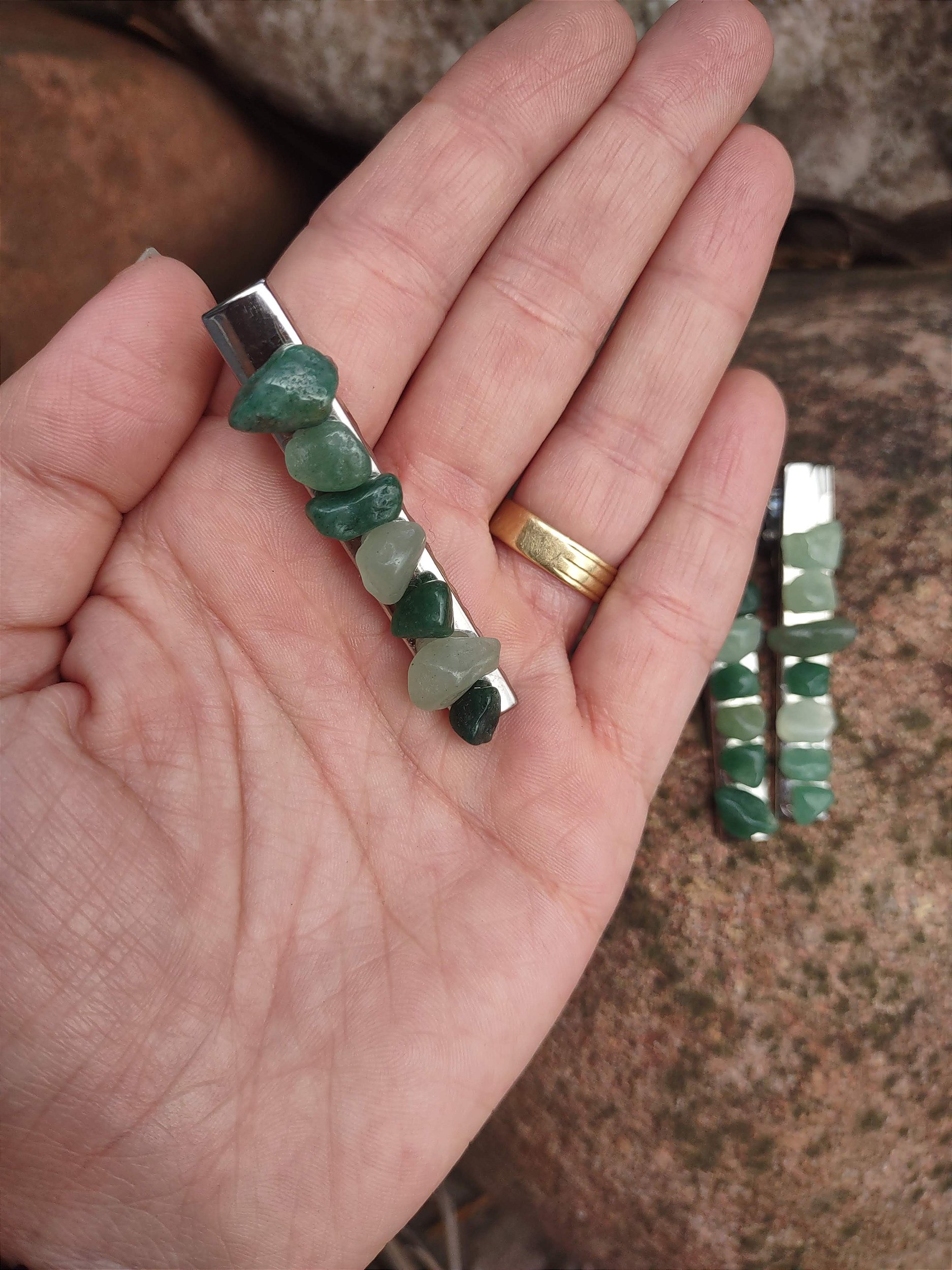 PRESILHA DE CABELO COM PEDRAS ROLADAS QUARTZO VERDE
